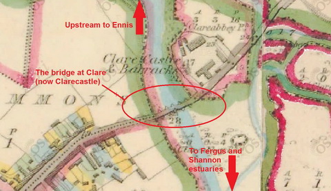 As well as a lock, some opening mechanism would have been required for vessels to get though the bridge, which was not the current flat structure; here is a photo of the old bridge.Beyond this it would be impossible to proceed without a pilot. The river beyond Coney Island winds through vast banks of mud, extending from 1 to 1½ miles from the shore, decreasing gradually in width from 600 yards, and varying in depth from nine to three feet up to the town of Clare, nearly seven miles in a direct line, and nine following the channel.