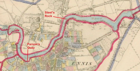 … and another quay further downstream. I put the next map in black and white to make it easier to see things; it’s scaled down from the Ennis map. The map also shows that O’Connell was right about the tide: it did flow well above Ennis.The other canal