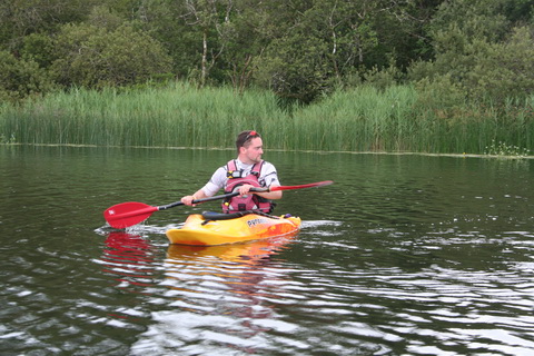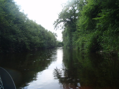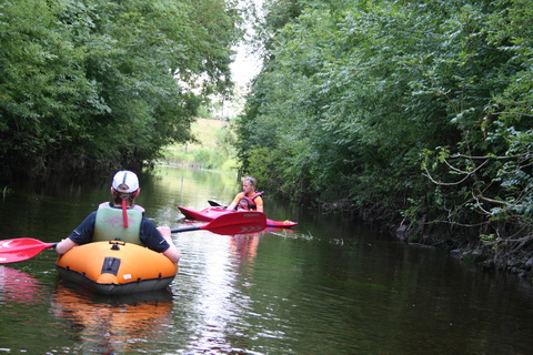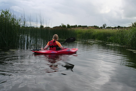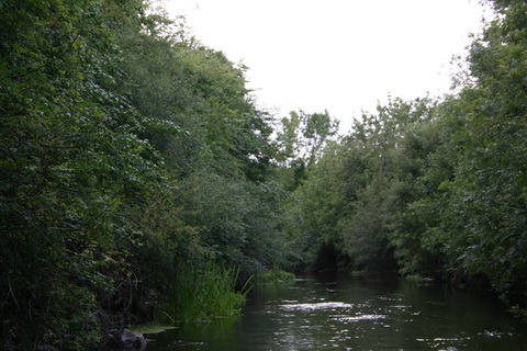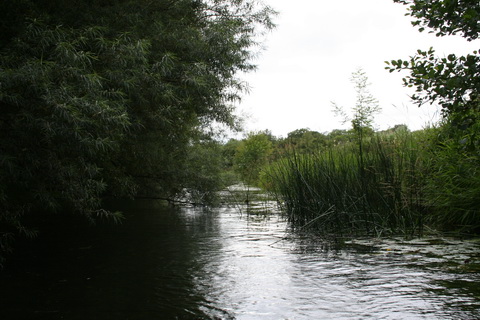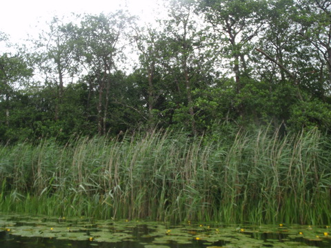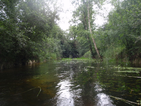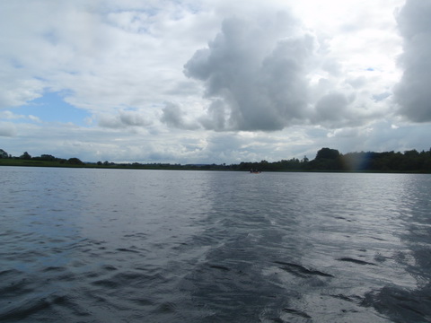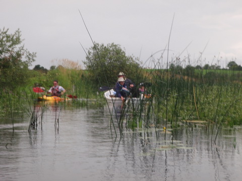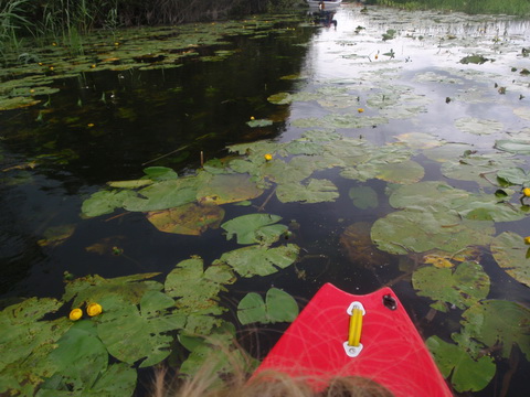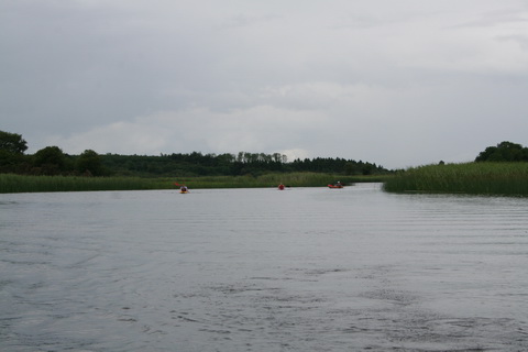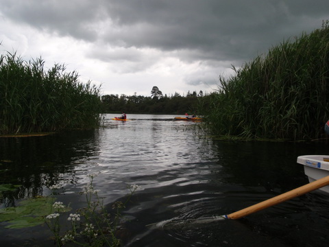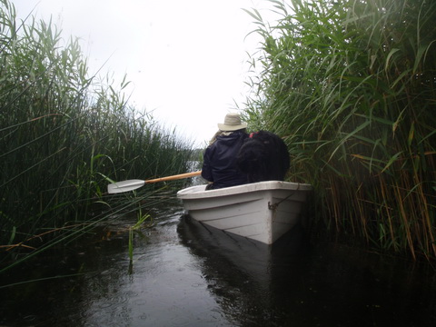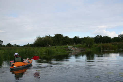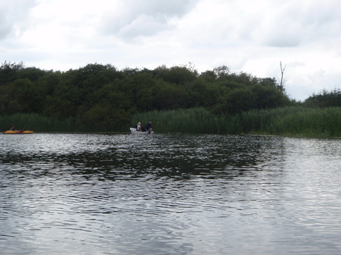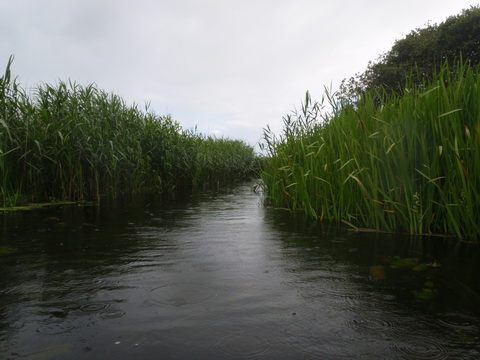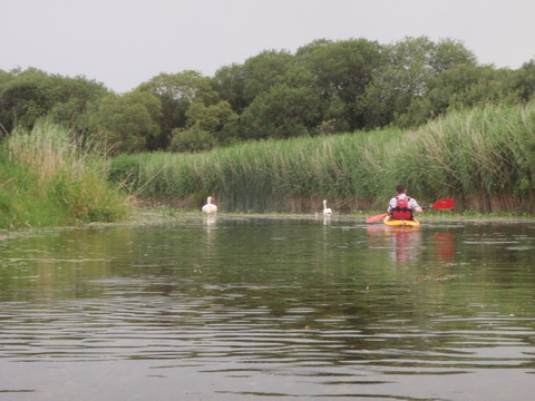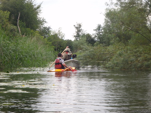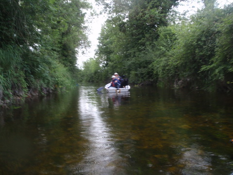 The weather had been relatively dry for several months and the water level was very low. On the other hand, the vegetation had flourished mightily: it was impossible to row the dinghy in the river sections and the propeller clogged with weed after a couple of minutes. We resorted therefore to using an oar (and later a spare kayak paddle) as a paddle, with the engine being used only on the lake sections. The kayaks had no problem, though. The journey took us four hours. I suspect that, without the weed, it would have been faster; the kayaks could probably have done it faster still without the dinghy to slow them down.
