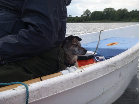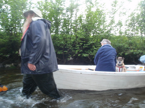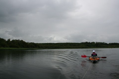 I don’t know what HIMC is, but it’s what the Walker Bay is made of. It stood up very well to the launch and to close encounters with the stony river-bed in the final stage of the journey. Water levels were very low, and an inflatable might not have been so happy, while a fibreglass boat might have had its bottom scratched. Most of the equipment was carried in the Walker Bay. We had a 2hp outboard (with spare fuel), oars, a boathook, a folding anchor, lengths of light rope, cameras, drinking water and chocolate-biscuit cake. We had, alas, no ginger beer. Everybody wore a lifejacket or a buoyancy aid suitable for kayaking; the dogs had their harnesses. We carried a GPS, a VHF set and mobile phones. We had (no doubt illicitly) printed off large-scale screen captures of the Ordnance Survey maps so that we would have some idea where to look for the exit from each lake. We kept them in a plastic envelope, but they still got wet (there was much rain). Nonetheless, they were useful.