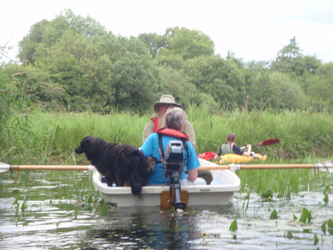 This is an account of a small-boat trip on part of the Rockville Navigation in July 2010. We arrived at Grange, in the Carnadoe Waters, on a larger boat. A car was available; we used it to transport our 10′ Walker Bay dinghy (with much equipment) and three kayaks (one of them an inflatable) to the bridge shown on the map. There were three young adults in the kayaks, two older adults in the dinghy and two dogs, one of whom liked to leap from boat to boat.