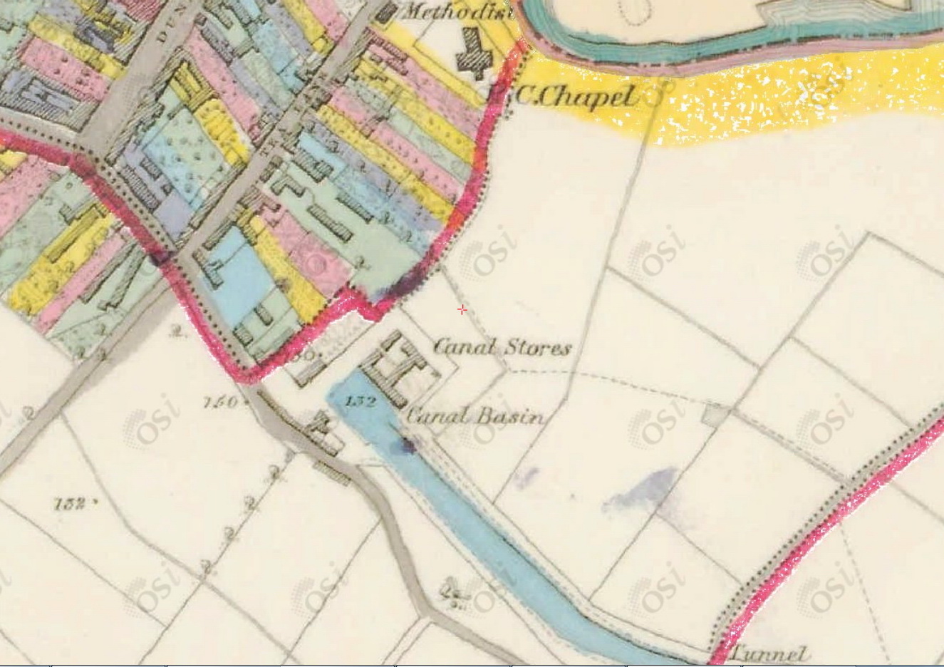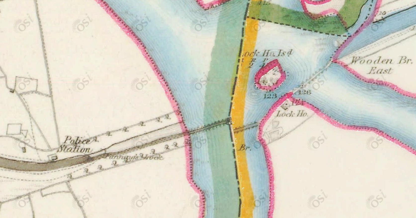 Fannings’s Lock and the Ballinasloe Line on the left; the Grand Canal and Shannon Harbour at top right [OSI ~1840]