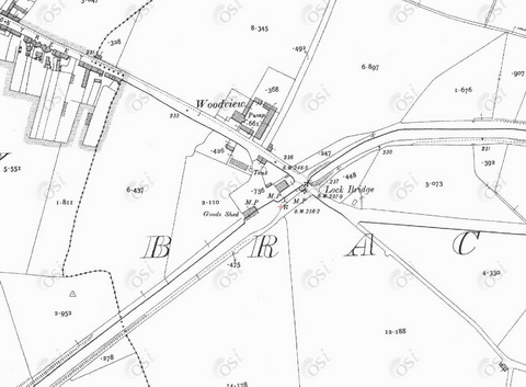 My guess is that the goods store shown in the photo is the goods shed just above the lock, as shown on the OSI map above, and that the railing in the foreground is protecting the footboard crossing the lock’s upper gates. That would position the store a little away from where I think the sawmills were: