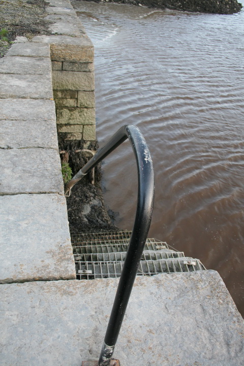 Modern mass concrete slipway possibly encasing older limestone slipway. Adjacent steps to Killadysert Quay. Circa 4 metres high at highest point. Rubble stonewall exists to left with two cast iron mooring rings in situ also. Circa 6 metres wide and 19 metres long.