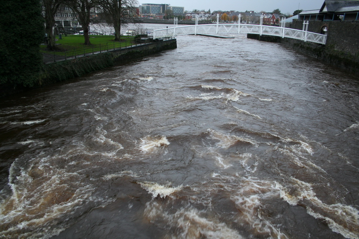 If you had been at Sarsfield Lock at low tide, you would have seen the weir. You can see it just emerging on my page Floods 28 November 2009: Sarsfield Lock to Abbey Bridge. Here is another photo and here is one from the far side of the river, from the top of a hotel.