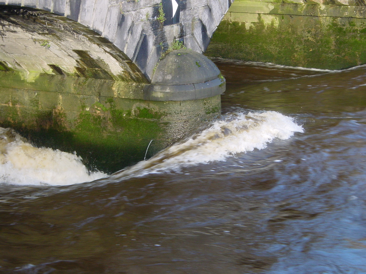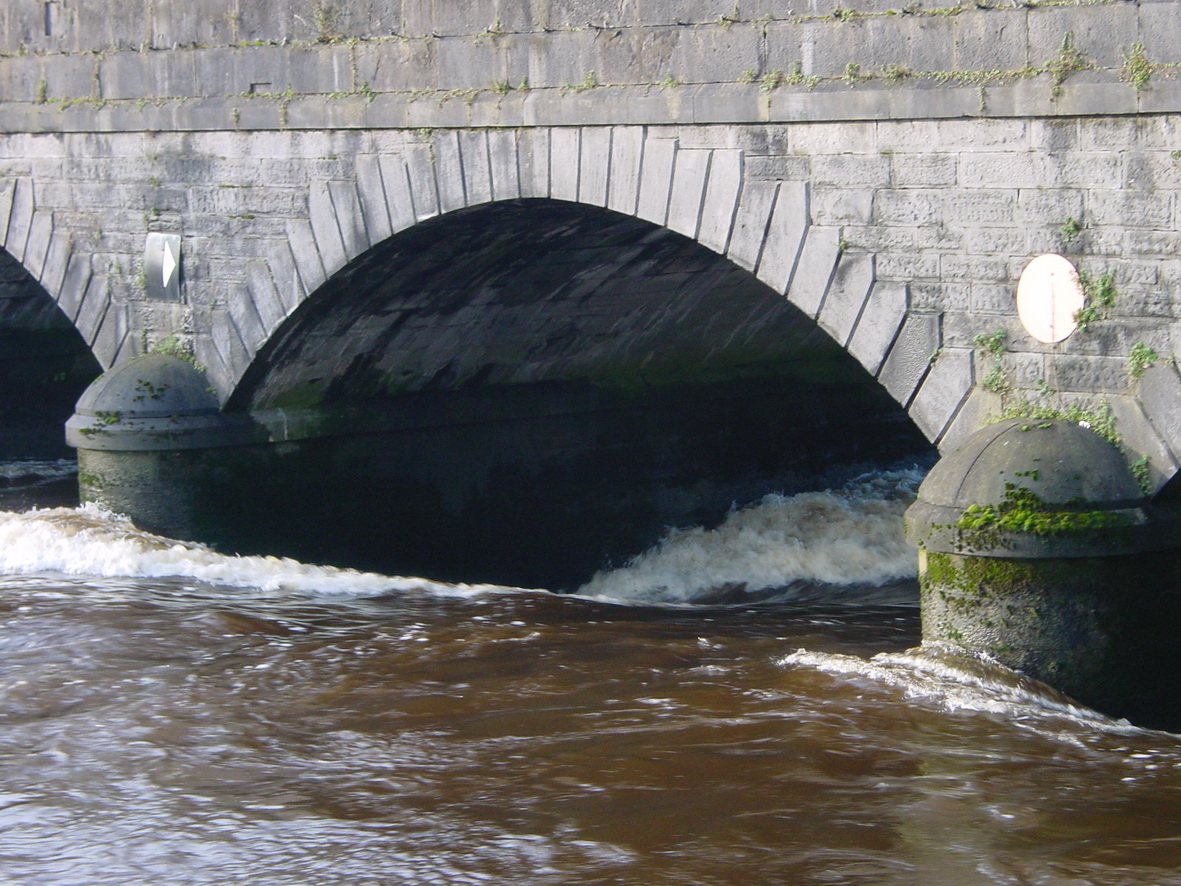 Then Limerick City Council, in designing its new mains sewerage system, decided to run the large pipe down the bed of the river, and realised that for relatively little cost it could build a wall on top of the pipe and thus keep up the water level in the Abbey River. The Abbey had traditionally three problems: (a) at low tide the water level was too low for boats; (b) at high tide the clearance under the bridges was insifficient and (c) the current was ferocious. The new weir has solved the first of those problems by keeping a minimum depth of water in the river; it hasn’t done anything for the other two. If you get your timing right, you will travel this streetch when the incoming tide has overtopped the weir and is just balancing the flow in the river; get it wrong and you have problems.