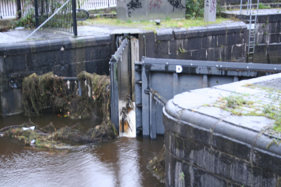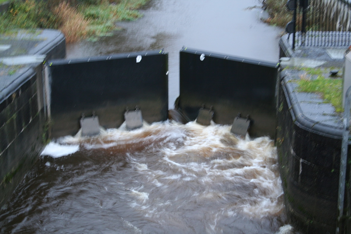 And here are the gates during the floods, held open to allow flood waters out. The first photo is slightly out of focus; sorry about that.
