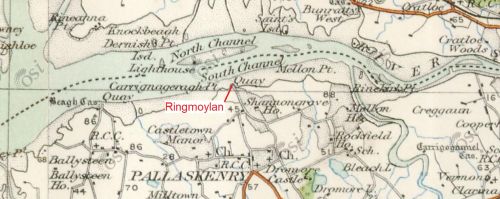 This suggests that there was a quay at Ringmoylan before 1838, although I know not whether that it the one that is there today. Nor do I know whether Mr Duhie’s embankment is the one shown on the OSI 6″ map (which I have called the east embankment) …