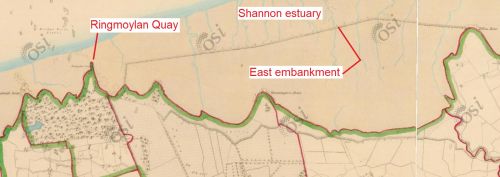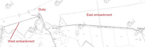 This suggests that there was a quay at Ringmoylan before 1838, although I know not whether that it the one that is there today. Nor do I know whether Mr Duhie’s embankment is the one shown on the OSI 6″ map (which I have called the east embankment) …
