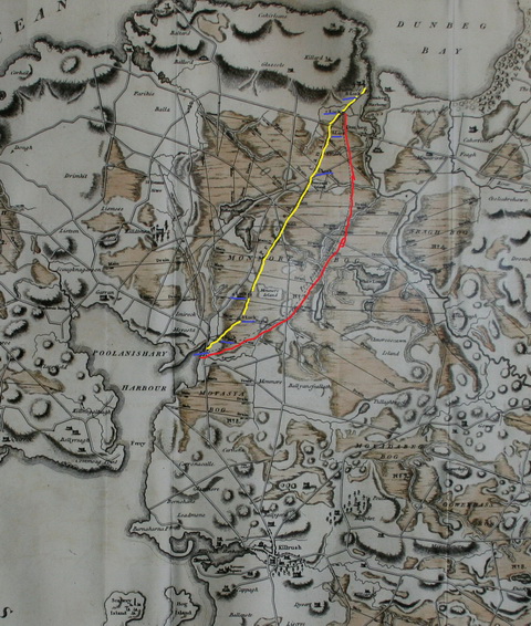 On 8 July 1822 he gave more details about the proposed canal. He included a proposal, on which I have found no information, that the canal start in Moore Bay, ie Kilkee, and “Garnan” (which I take to be Garraun, close to Blackweir Bridge) at Pooolanisharry. You can see both areas on the OSI map here, but you’ll have to zoom in to read Garraun. That proposal might have helped Kilkee’s tourist trade, but it is hard to see what other purpose it might serve.