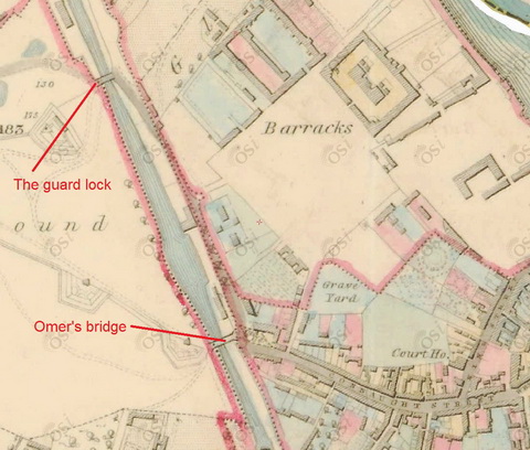 Boats passing through Athlone nowadays use a lock in the river, beside the weir and downstream of the current road bridge. Lock, weir and bridge were constructed by the Shannon navigation commissioners in the 1840s.