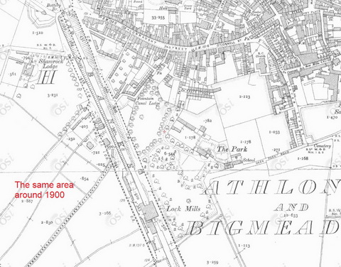 Isn’t this interesting? First, it shows that, although the canal was bypassed in the 1840s, it was not officially abandoned until 1982 (though I wonder when the lock gates fell down). Second, it suggests that Waterways Ireland (as successor to the Shannon Commissioners and the Commissioners of Public Works) still owns the canal, although I admit I’m making an assumption there. Third, it shows why Cllr Aengus O’Rourke said that Athlone Town Council would have to be involved in doing anything on the stretch from the Galway Road Bridge to the Battery Bridge: the town council seems to have leased that section, and the next as far as the lock, from the Commissioners of Public Works. I’m not clear about the role of Westmeath County Council and I’m assuming, open to correction by Athlone folk, that Heatons Mill Bridge was the bridge over the lock as shown on the ~1900 OSI map.