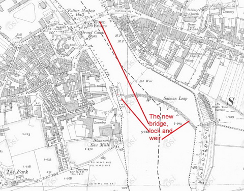 The Mick McQuaid bridge, I presume, is the one from Deer Park Road, not the pedestrian bridge at the Shannon end. It is not shown on the Ordnance Survey 25″ map, from around 1900: http://map.geohive.ie, select Data Catalogue and then Base Information and Mapping and then Historic Map 25 inch. (It doesn’t seem to be possible to provide links to precise locations.)