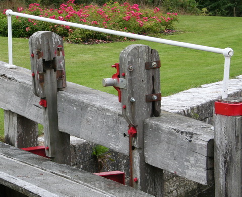 You may be able to see, in that photo, that the remaining manual rack has had a white collar attached so that it can’t be operated by a canal lock key (windlass). Here’s a close-up from the other side.