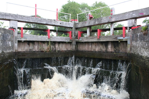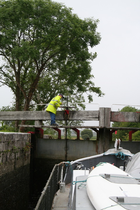 We had a standard canal lock key (windlass), and we knew that we would be able to operate Clondra Lock and let ourselves through. Unfortunately, none of the other boats in the queues (even PM’s VM), either below or above the lock, were so equipped. So, in order to be able to get through ourselves, I had to operate the lock for several other boats in each direction — in the pouring rain. Eventually, our boat got into the lock, up and out, and I hopped back on board, no doubt leaving the other boaters wondering why they were being left to await the keeper’s return from lunch.