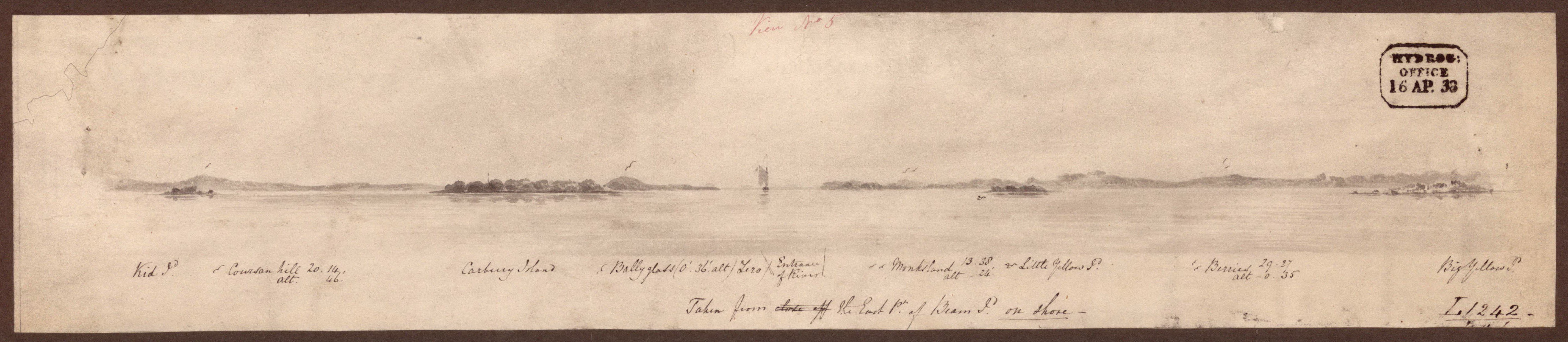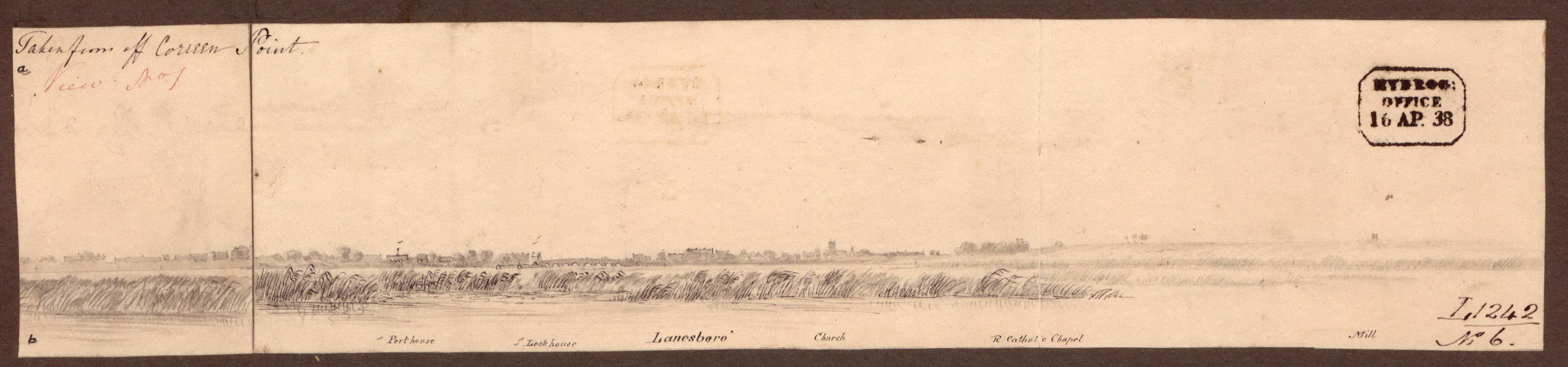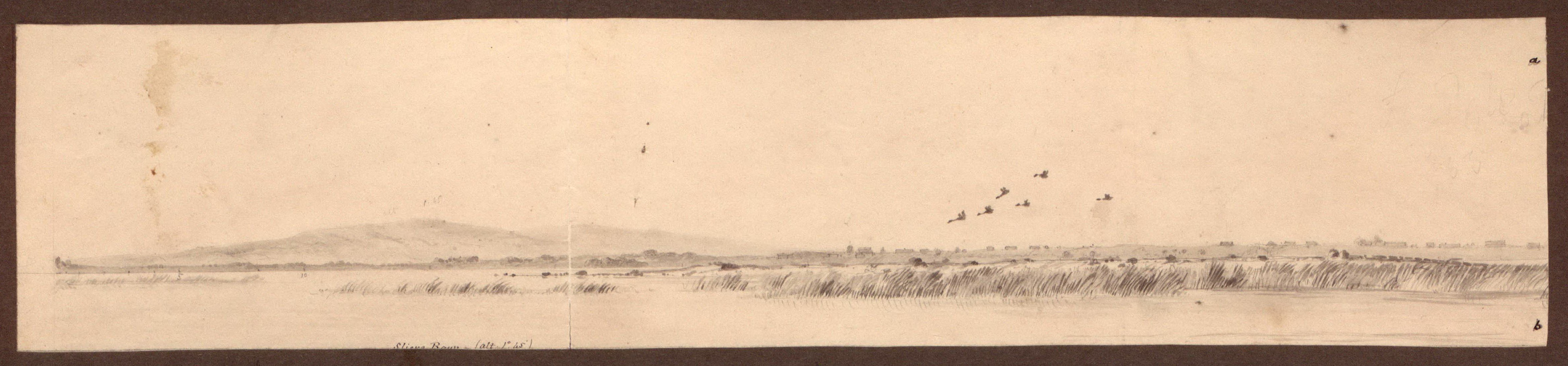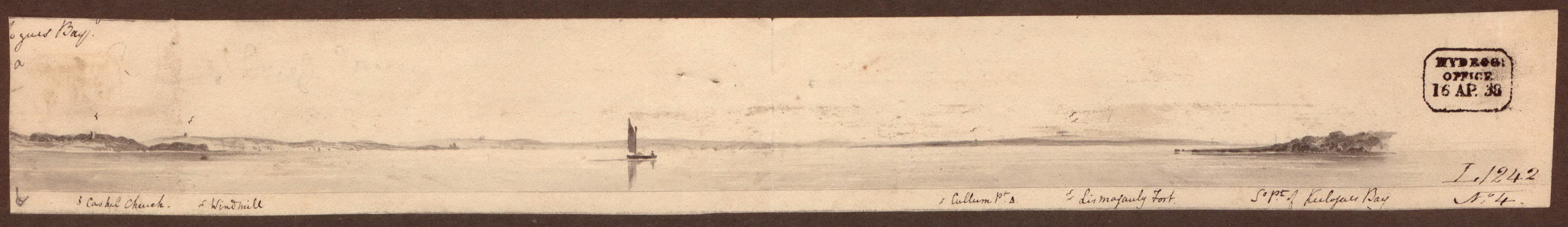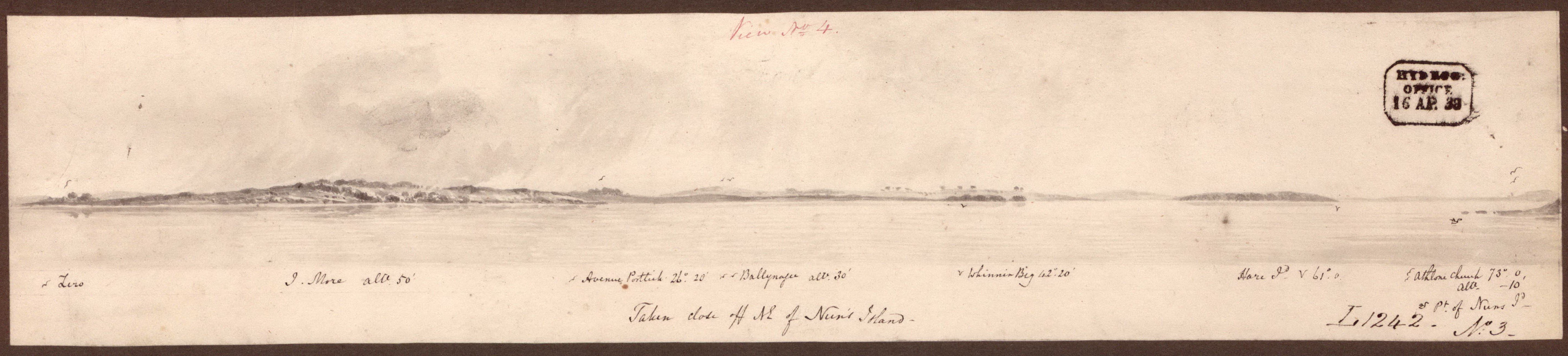 But while surveying they also made drawings — Views of Lough Ree — showing what a ship’s master might see from certain locations on the lake. Those drawings were held in the United Kingdom Hydrographic Office until 2003, when they were transferred (with other historic documents) to the National Archive of England and Wales.