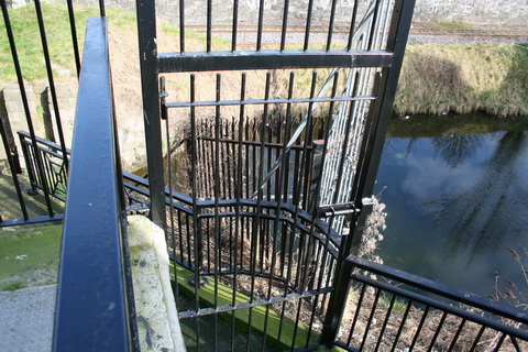 As far as I can see, once you’ve opened the right-hand gate, you’re stuck on the island between canal and railway. So you need a minimum of three people for this lock: one on the boat and one on each gate. (Most Irish canal locks don’t have ladders.)