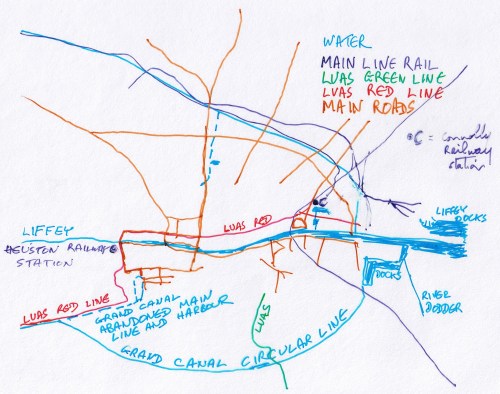 This is a very rough sketch map. It doesn’t show all the streets; those it does show are in a brownish orange. The canals, the Liffey, the Dodder and various bodies of water are shown in blue; broken blue lines show canal lines that no longer exist. Green is the LUAS (tram: pronounced like “Lewis”) green line and red is the LUAS red line, which follows part of the abandoned Main Line of the Grand Canal. Black is for railways; I haven’t shown all the lines on the north side of the Liffey. Nor have I shown the lines running in to Heuston (formerly Kingsbridge) station. I couldn’t fit the legend “Connolly Railway Station” (formerly Amiens Street) at its correct location so I put in a black dot with the letter C beside it and explained it at the right-hand side.