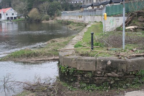 The old quay, with mooring posts (MP) now replaced by rings and spikes, fell out of use when the railway bridge was built