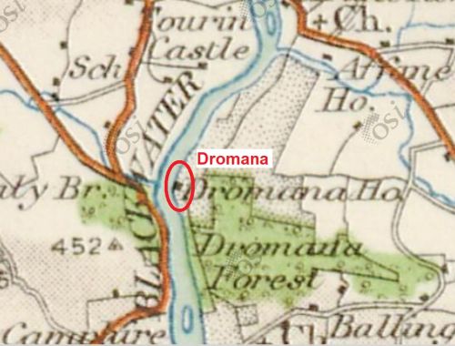 The house is upstream from Villierstown and on the opposite side from Camphire (OSI 25″ ~1900)