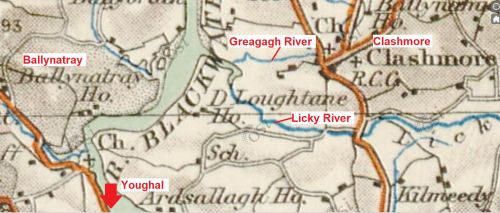 Raheen or Ballyheeney is nowadays (or was in 2015) a small, quiet place on a tributary of the Blackwater, close to the lower or Youghal end. Two rivers join the Blackwater at the same place: the Greagagh to the north and the Licky to the south. The Licky looks like the larger river but the Greagagh flows through Clashmore and had a couple of quays along it. It’s not far below Ballynaclash quay.