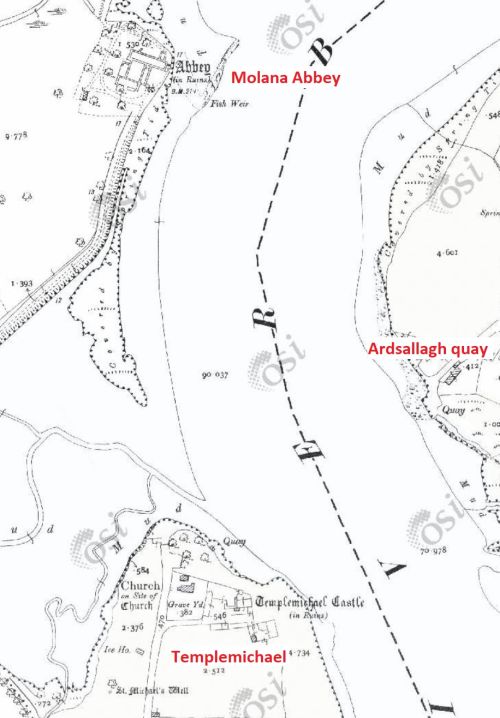 Templemichael and Molana Abbey have, as far as I know, no navigational significance. And, unlike (again, as far as I know) the other places shown here, they are on private property: that of the Ballynatray Estate.