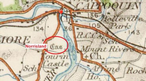 I can’t locate it precisely on the map, but it is said to be around Norrisland. I’ve written in the name of the area on the map below: it appears on versions of the map at larger scales but not, alas, on this one, so I’m not sure whether the “Cas” shown below is Norrisland or the old Tourin Castle.