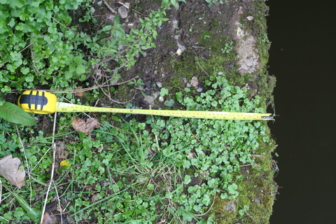 We tried measuring the width of the canal [it would be nice if someone would invent a tape that would stay rigid when stretched across a canal] and reckoned it was about 14 ft, with the towpath only about 20 in.