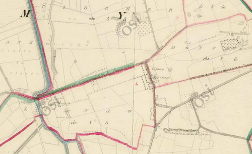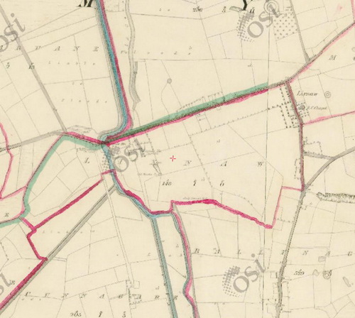 But enough of this. Lixnaw had at least four canals. The next map extract shows the junctions of three of them. One comes down from the north (ie from the top of the map), turns briefly west and then south(ish) again; a second goes off to the south west from there and a third heads for the middle of the bottom edge of the map. All three of those are marked with the word “canal” on the 6″ Ordnance Survey map.