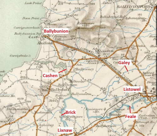 Lixnaw, in Co Kerry, stands on (or near) the River Brick, which is one of three — the Feale and the Galey are the others — that, once joined, form the Cashen (or Cashin), which flows into the sea close to Ballybunion. As Samuel Lewis put it: