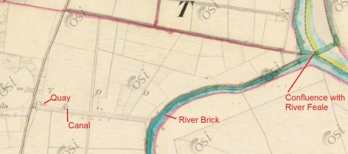 I didn’t find anything, alas. I’ve just had a quick look through various directories and gazetteers and I see nothing relevant; I also flew over the area using the OSI 6″ map but again without success (though I did find a fourth canal, which I’ve added to the page). Sorry about that.