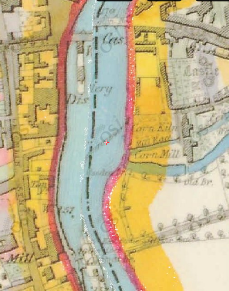 The 6″ OSI map of around 1840 suggests that, on both sides of the river, there were ramps between the trackway and the bridge. The later 25″ map suggests the same, as does the Google Maps satellite view and Street View. So the first aspect is OK: a horse could get from the trackway below the bridge on the east bank to that above the bridge on the west bank, or vice versa. But it strikes me that, at best, the boat would get to the west bank below the bridge: the trackline would then have to be released, fed through under the bridge and reattached.I’m not clear how a horse-drawn boat would move between the quays above and below the bridge on the west bank: from the photos I’ve found online, I don’t think there was horse-headroom under the westernmost arch. Perhaps ropes and manhauling? That puzzle remains both for through-traffic and for boats loading or unloading at the malthouses below the bridge.