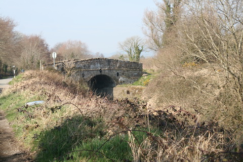 The bridge has a second arch over the land on the northern side of the river. Having neglected to arm myself with a flame-thrower and a machete, I could not get near enough to measure the arch; indeed I could barely see it. I wondered whether it might have been intended to span a towpath (as with some Suir bridges), but the road (which becomes a track) is on the south side of the river.