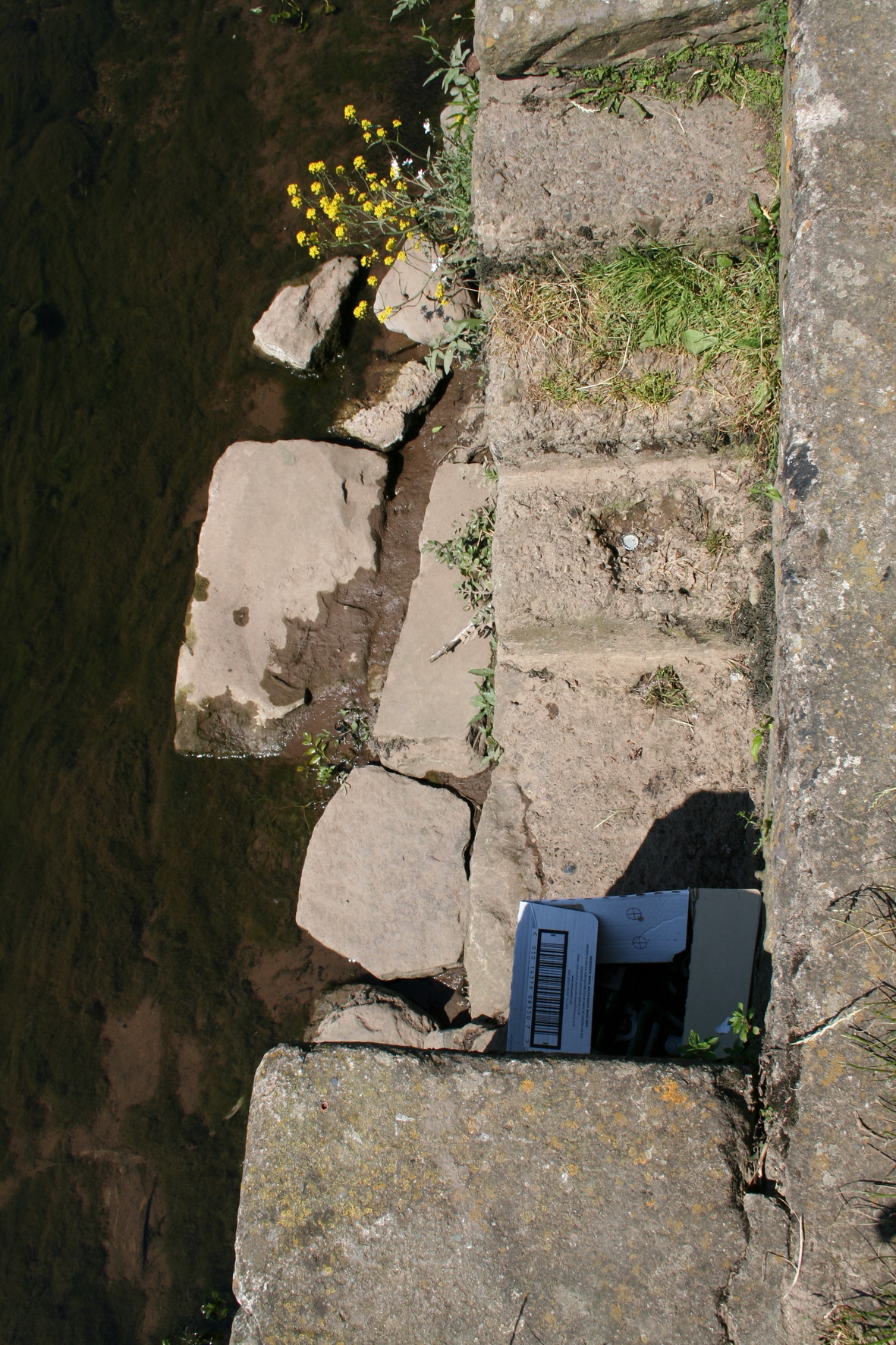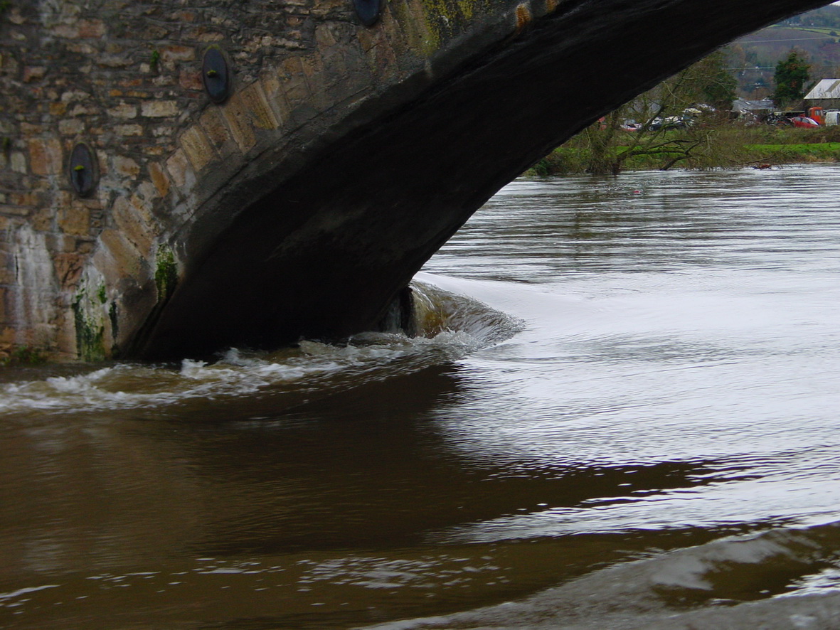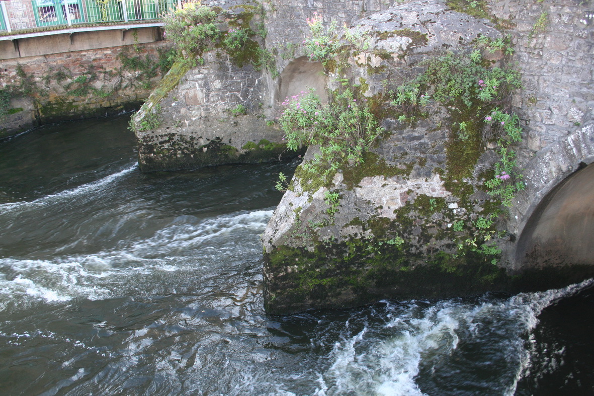 Prothero said that “the river rushes down from the weir above with great fury”. Here’s what he was talking about. The photo below shows the current below the Old Bridge, with Prothero’s left arch nearest the camera. This photo and the one below were taken in September 2008, after several dry days.