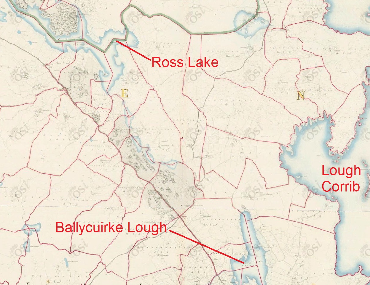 This first map, from the ~1840 OSI, shows Ross Lake, the top end of Ballycuirke Lough and Lough Corrib.