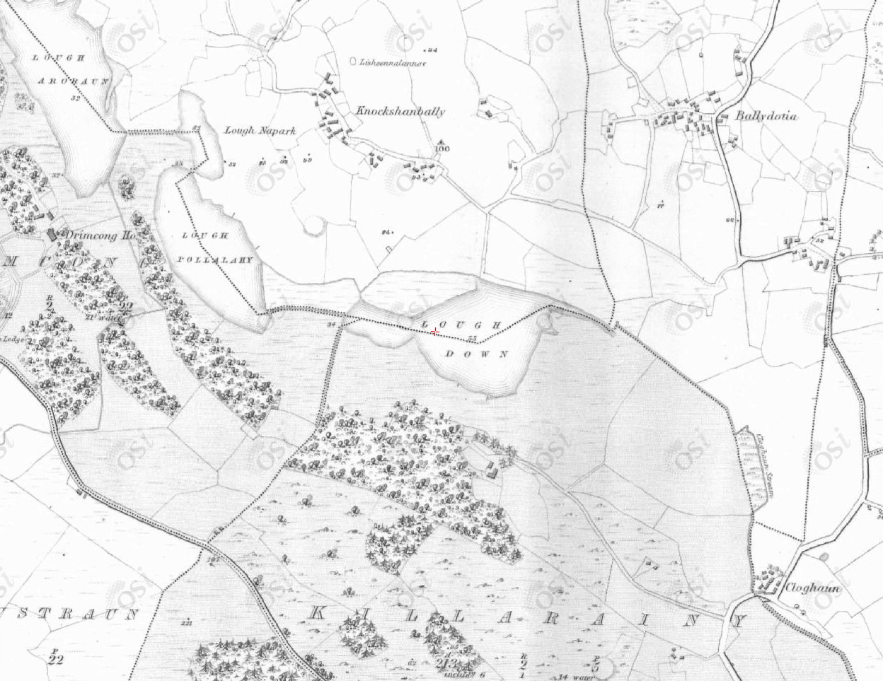 Switch to black and white because the boundary lines are less obtrusive that way. The next ~1840 extract shows the bottom end of Ross Lake at the top, with a quay marked. It’s not clear whether there was a channel linking Ross to the next (small, unnamed) lake, but that lake does have a channel to Lough Hemushmaconry and there is another from there to Lough Arobaun.
