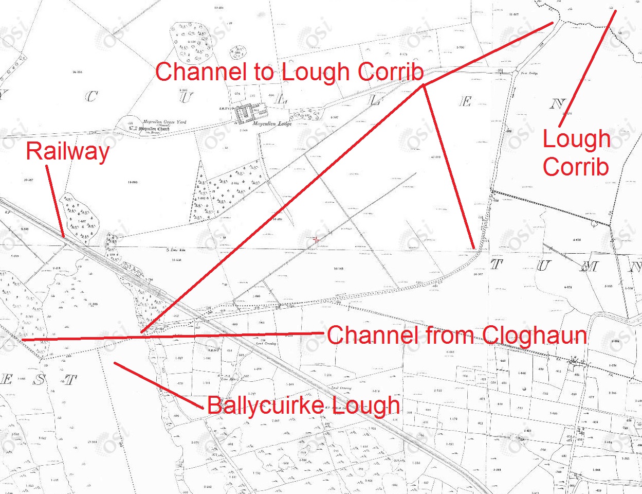 The next map is from the OSI ~1900, and there is now a channel from the east side of Ballycuirke Lough to Lough Corrib. There is also a straight channel running into the west side of Ballycuirke Lough.