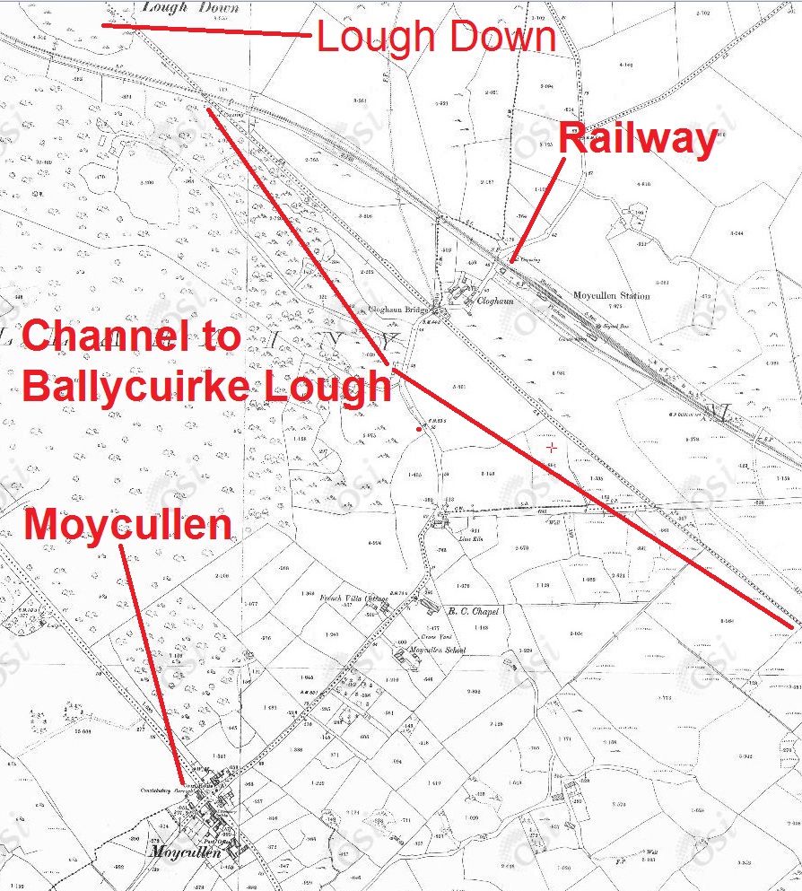 The later ~1900 Historic 25″ then shows another straight channel from Lough Down, through Cloghaun to Moycullen (Ballycuirke) Lough. From the far side of the lake, an artificial-looking channel curves to the Corrib, joining it at this point. So it might be that the system was developed in the early nineteenth century but linked to the Corrib only in the later part of the century. It might have been constructed for drainage, but that wouldn’t stop it being used for navigation as well.