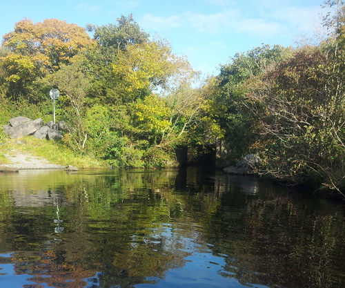 This canal is free of dangers with the sole exception of a large rock in the middle of the canal about 20–40 yards north of the overhead power lines. As the water is peaty you will not see this rock.The entrance to Ballyquirke Lough is under a road bridge; the deepest water is in the middle and in flood there is a significant current. Headroom is 4–5 feet. There is a good place to beach on the right after the bridge.