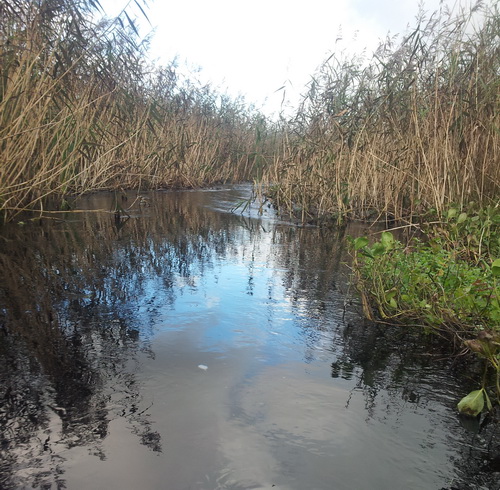 The reeds are strong and dense and care is required. Energetic poling is needed to penetrate the reeds sufficiently to discover if you have hit the right spot. It is not possible to do this under engine. I used a fold-up anchor (chain removed) as a grappling iron to throw and pull myself through these dense reeds. Sometimes several attempts are required as visibility in the reeds is quite limited. This can be quite tiring.