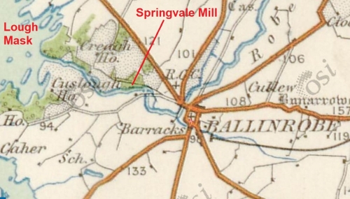 As the Cong Canal was intended to be just one link in a navigation extending from Galway Bay to Loughs Mask and Carra, it was thought that it would be a good idea to enable navigation to Ballinrobe, the only sizeable town on or near Lough Mask. It had several mills and a brewery (or at least the prospect of one) and the engineers gave much attention to the maintenance of water supply to the mills and for other uses. Making the River Robe navigable would require only one lock, which could be built near Springvale Mill.