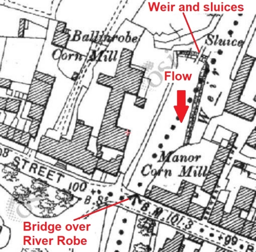 Two of Ballinrobe’s mills were above the town bridge, with a weir and sluices to provide water supply. The Board of Works undertook the work.