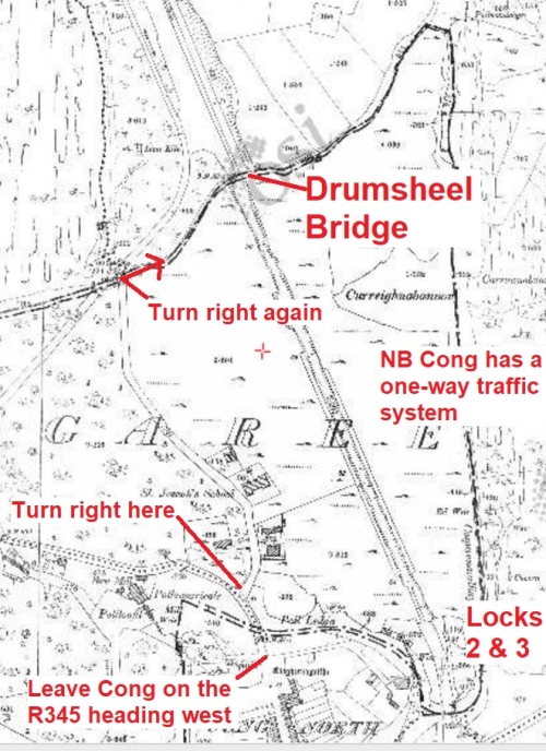It looks as if the road into the car park was built across the line of the canal. The R345, entering Cong from the east, was realigned to run alongside the canal, crossing it below Cong lock, after a right-angle bend, on a bridge of “16 feet [4.88 m] span and 24 feet [7.32 m] breadth of roadway”. That means that there is no towing-path under the bridge.
