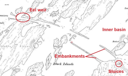 You will (all going well) arrive at the point marked “Eel weir” on the map. You will see that there is no embankment or towing-path along the canal to dry land. A channel was dug out into the lake; the spoil was used to form the embankment on the south-west side between the sluice and the Black Islands. The engineer’s reports refer to cutting a channel through the Lackbin Shoals, said to divide “the inner from the main basin of Lough Mask”, but the OSI doesn’t seem to use the term.