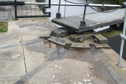 There are recesses for centre gates too, although no centre gates are now fitted. This is the east-side recess. Note the cut-outs here too. And what is the vertical pipe for?