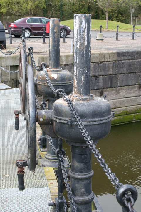 I presume that the vertical shafts are raised within the upper cylinders but I'm not clear why that protection was thought to be needed. Is it because of the sea air? Note what I take to be hydraulic hoses underneath: presumably the modern lockkeepers don't have to wind the wheels