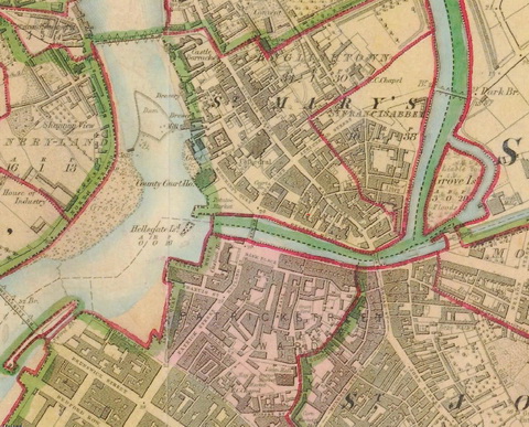 The main line of the River Shannon flows from top to bottom on the left-hand side of the map. At the time of the map it had mills; it still has the Curraghgour Falls, which make this stretch unnavigable except for canoes and, at high tide, for very knowledgeable locals.