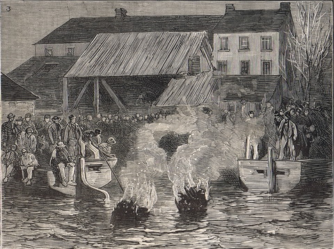 This is from The Graphic of May 13, 1882, and shows the lighting of tar-barrels in Portobello Harbour, on the Grand Canal in Dublin, to celebrate the release from prison of Charles Stewart Parnell and two colleagues.