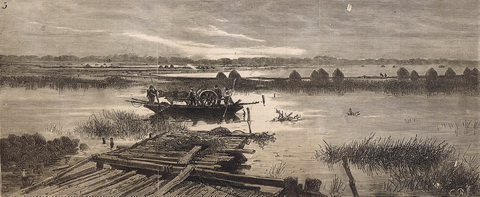 The original caption says “Boat and Landing-stage for removing Haycocks”.