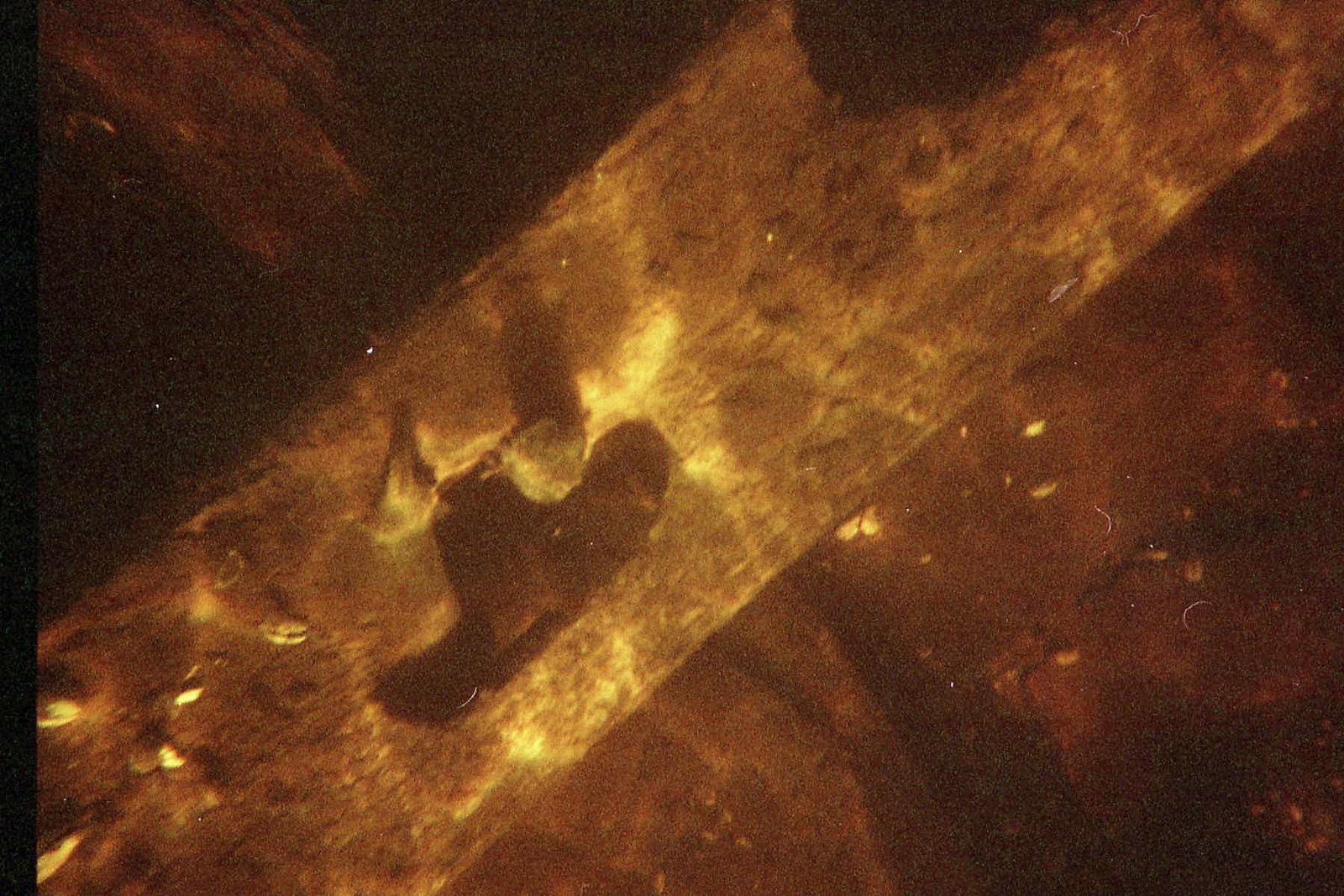 The keelson, running diagonaly across the photo, showing one of the many slots cut into it and a metal spike protruding from it (the top of the spike appears as a cicular shape, but its shadow betrays its height